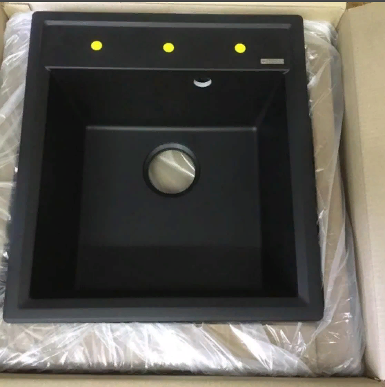 Раковина из артгранита. В составе указан кварц. Ей уже практически 4 года, выглядит как в первый день установки. Черный стильный цвет.