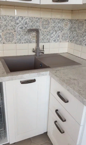 Всегда пользовалась круглыми мойками, но в наш интерьер лучше подошла квадратная. Конечно, есть свои особенности... Теперь нужно тщательно вымывать уголки.