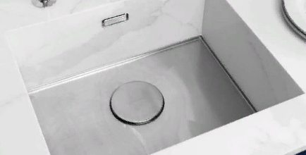 Первая мойка OMOIKIRI с интегрированным типом монтажа. В этом случае столешница из натурального или искусственного камня переходит в стенки мойки, а дно при этом остается из нержавеющей стали.