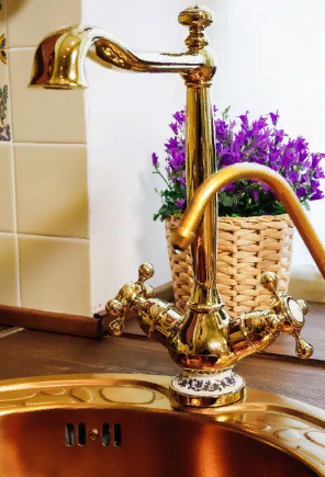 Выглядит дорого. Золотой цвет отлично вписался в нашу классическую кухню. Следов налета не остается, ухаживать легко.